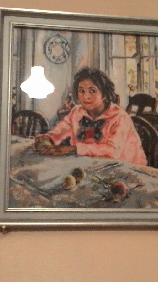 Хоть и не идеально по сравнению с оригиналом. Но, чесслова, Вы большая молодец, что рискуете вышивать такие узнаваемые картины!В целом очень даже прилично получилось!