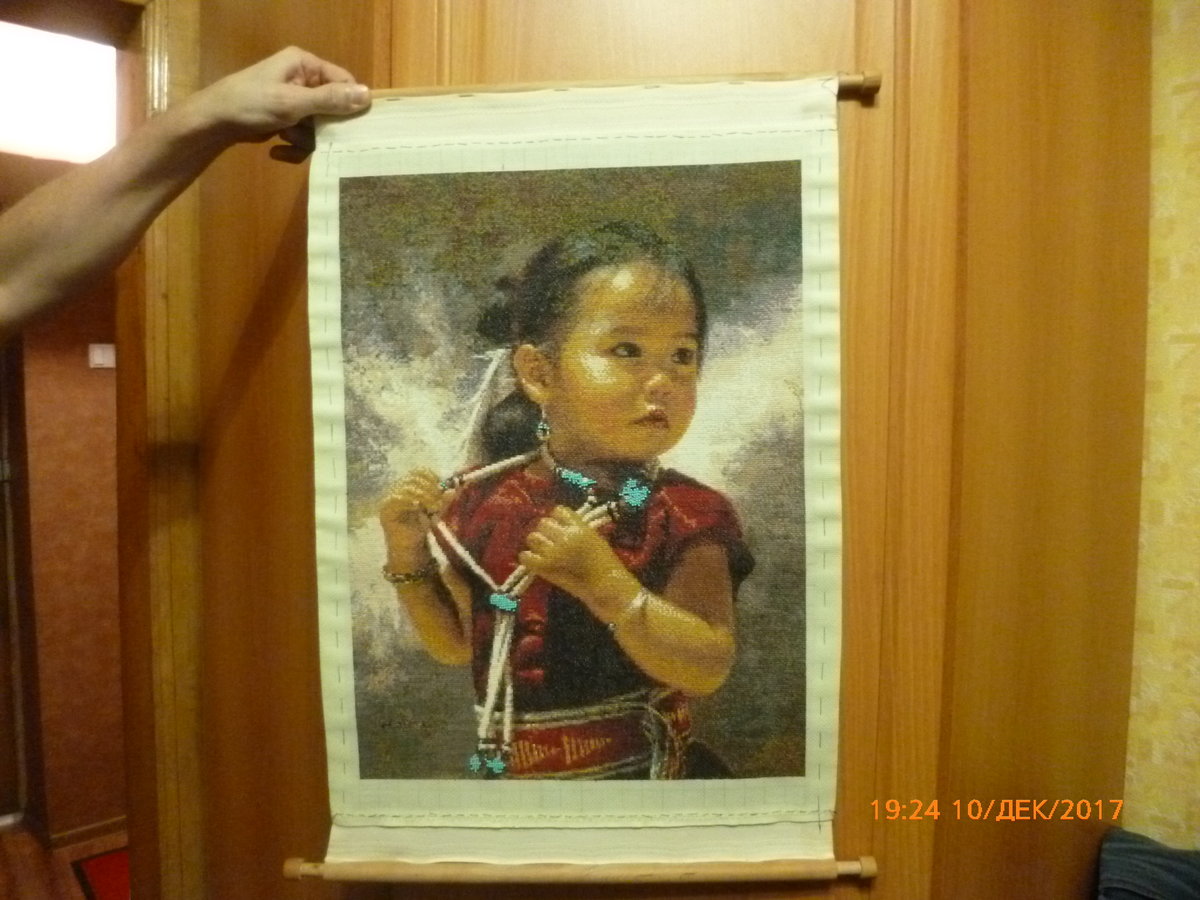 Размер вышивки 220х268 крестиков.Схему делала в програмке СтичАрт. Нитки Гамма. Бисера немного, только бирюзовый на украшении. Насыщенность вышивки конечно существенно отличается от оригинала.Сейчас попробую скинуть оригинал. Но ведь и программа не профессиональная, да и я не дизайнер. Вышивала для внучки в подарок.