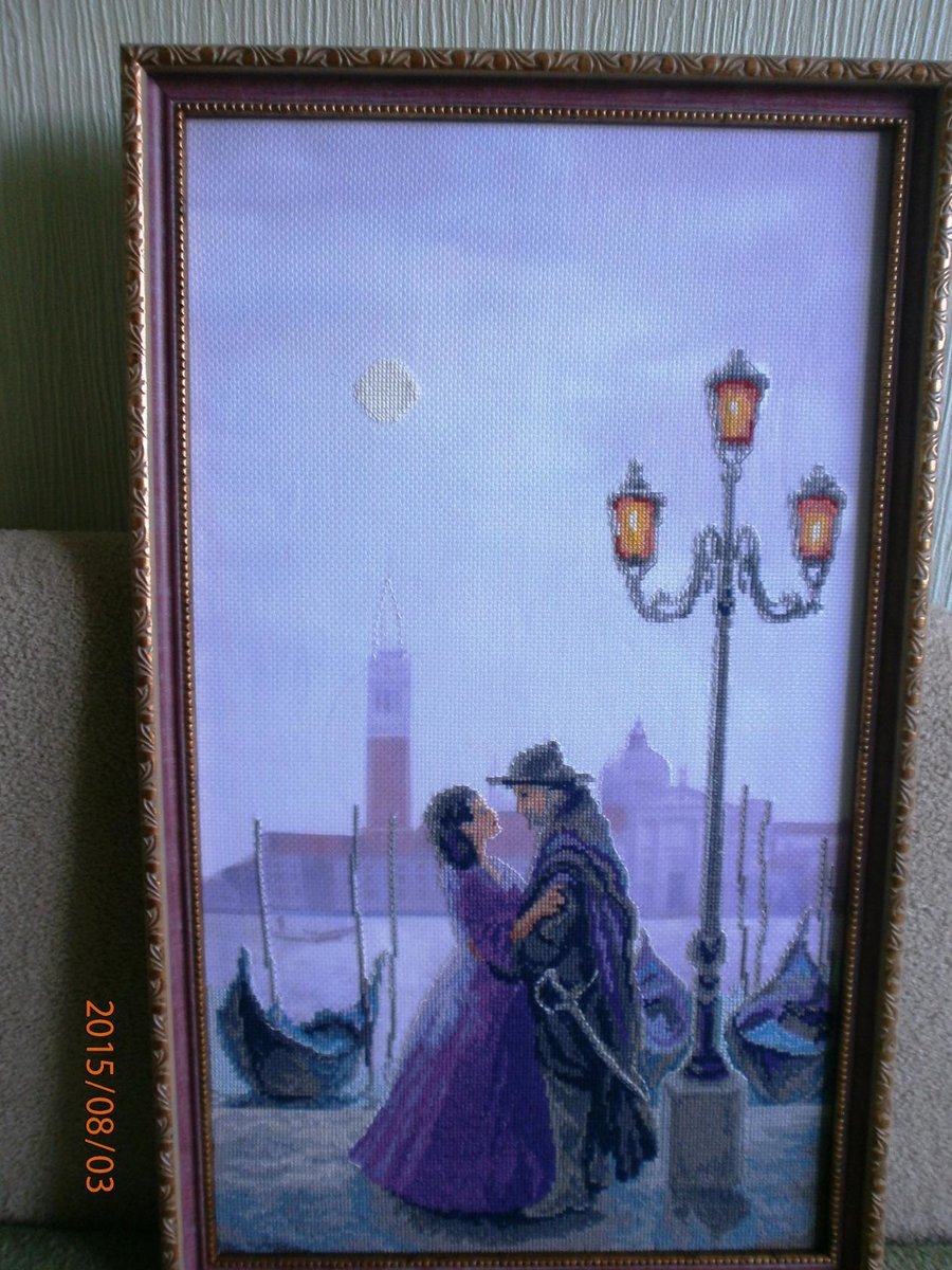 Авторская канва, контур работы, луна, фонари выполнены из неоновых нитей, светятся в темноте, 2015 год.