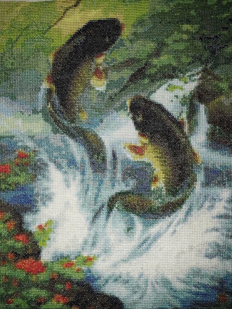 По поводу этой схемы на этом сайте я встречала спорные мнения - кто-то начал вышивать и бросил, не увидев ожидаемого изображения. И даже после этого я решила все-таки вышить рыбок. Канва Аида 18(вроде бы), нитки DMC. По-моему, канва взята не того размера. Интересны ваши мнения. Сейчас работа находится на оформлении, после выложу готовую.