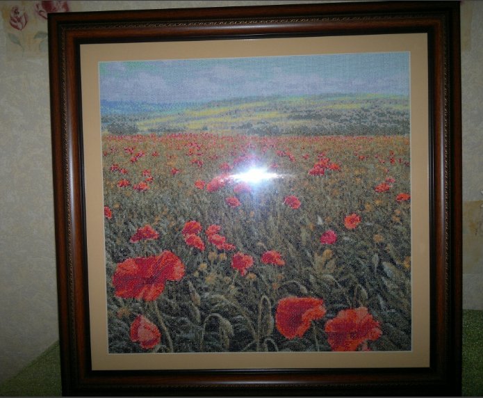 Красиво! Нужно выбрать место размещения фотоаппарата, чтобы блик оказался за картиной. Антибликовое стекло я тоже раньше ставила все время, а потом увидела, что под ним картина значительно тусклее. Сейчас даже не могу сказать, что лучше. Сейчас у нас в багетках появилось прозрачное антибликовое стекло -шикарно прозрачное и не дает бликов, но очень дорого.