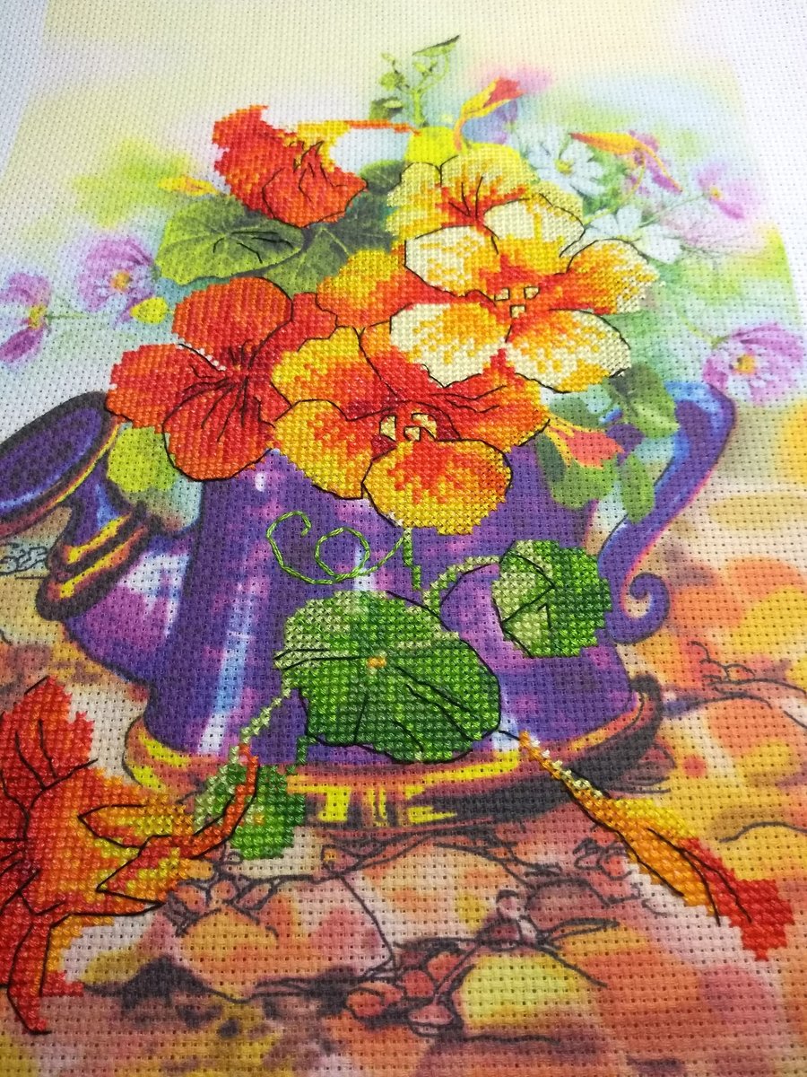 "Садовая лейка"Артикул:№0068 РТ Нитки: мулине Anchor Цветов: 14 Игла: 1 вид Размер: 21*30 см Канва: 14 Aida Zweigart с напечатанным фоном Рисунок фона нанесен на канву. Отдельные элементы (лейка и цветы) вышиваются счетным крестом.