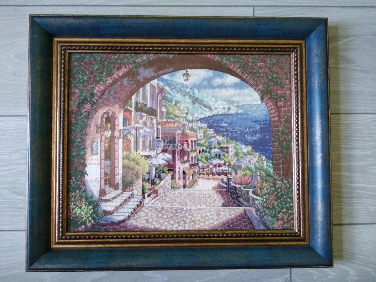 Не смогла четко сделать фото, поэтому и выложила перед этим фото без рамы. Такое вот оформление у меня получилось. И "Прибрежный вид" и "Европейское бистро" оформила в деревянный багет без паспарту. Багеты одинаковые, отличаются только цветом. В общем - красота!))