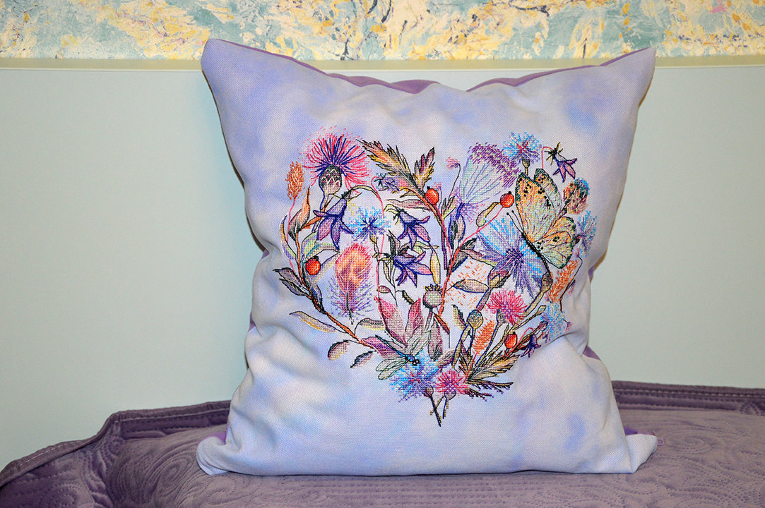Оформила вышивку в подушку) Размер получился 40х40. Вышивала на Lugana 28ct, которую предварительно покрасила красками для ткани Decola фиолетовый + голубой. Вышивка по собственной авторской схеме. Количество цветов ДМС 40. Используемые стежки: крест, полукрест, бэкстич, фр.узелки.
