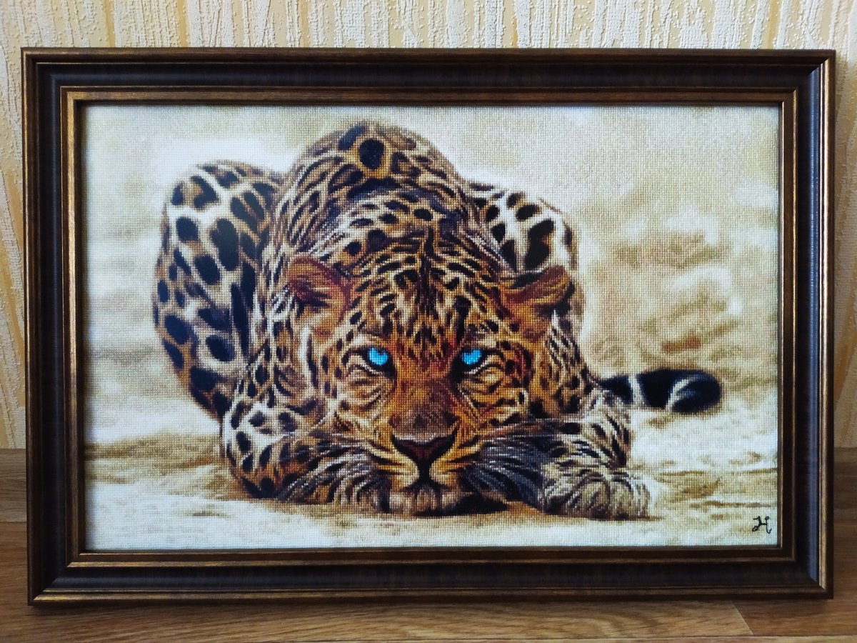 Оформлен мой леопард. Пасмурное, дневное освещение. Стекло антиблик. Работа вышита в подарок сыну в его День Рождения (23 года), который будет на днях. Как-то я выбирала, что начну вышивать и показывала варианты 5-7 сюжетов возможных будущих картин сыну, и именно этот сюжет привлек его внимание. О подарке он не знает, живет отдельно, я думаю, что это будет ему приятным сюрпризом.