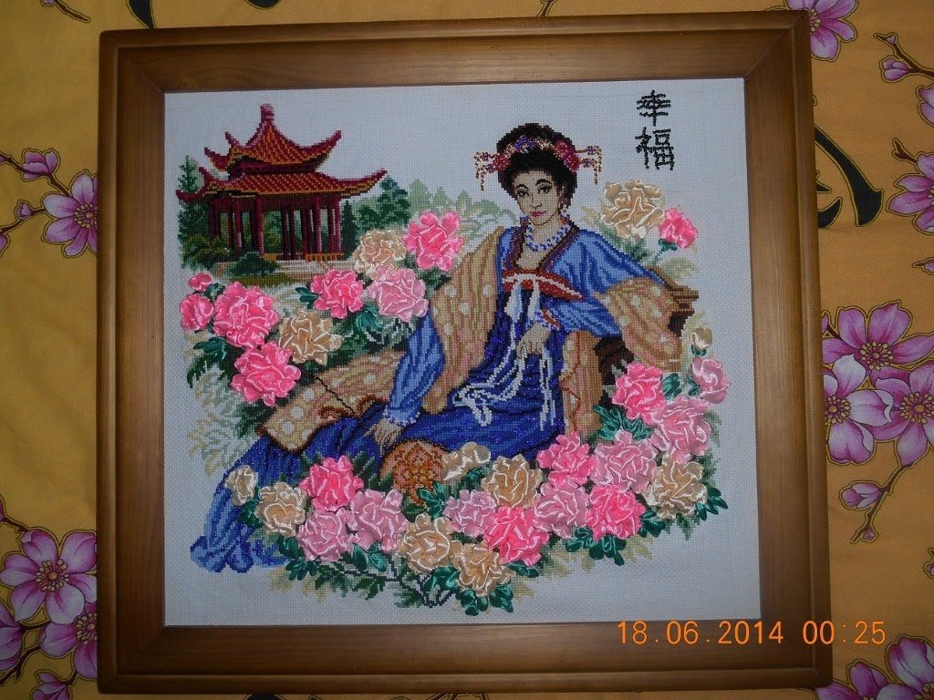 Вышивка выполнена в трех техниках , бисер, лента, мулине