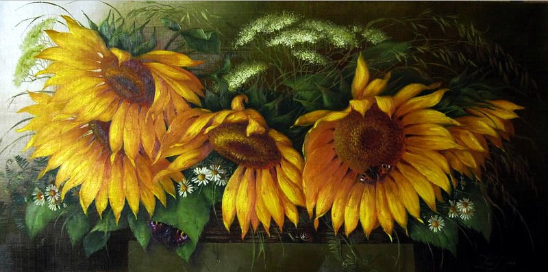 Теги: птицы, цветы, натюрморт, подсолнухи.