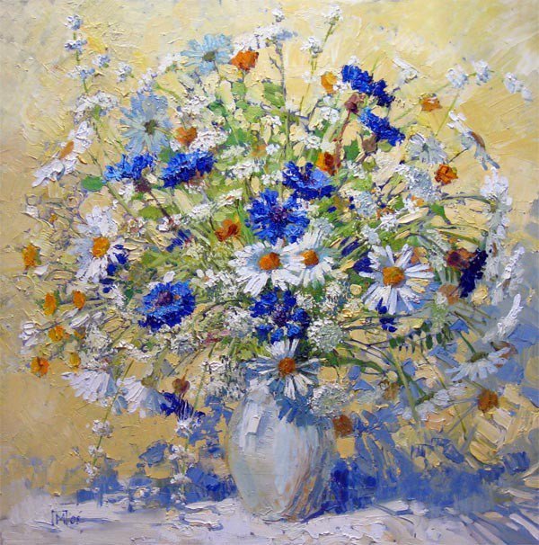 Теги: полевые цветы, букет, васильки, цветы в вазе, незабудки, натюрморт.
