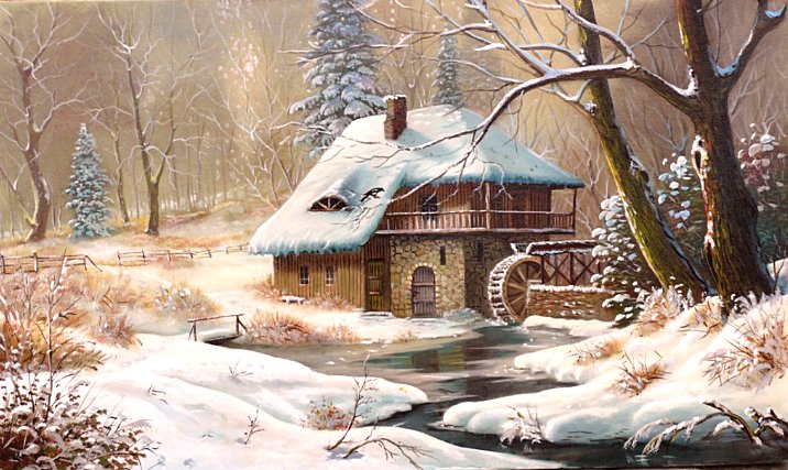 Теги: пейзаж, горы, рисунок, река, природа, живопись, мельница.