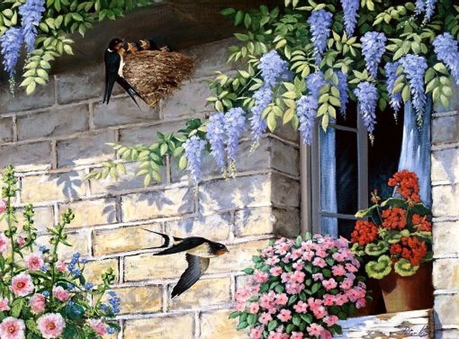 Теги: ласточки, окно, балкон, винтаж., цветы.