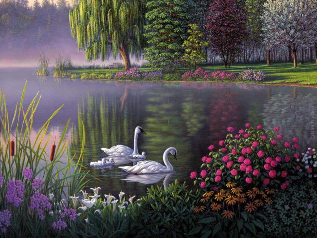 Теги: озеро. лебеди. пейзаж. дом у воды..