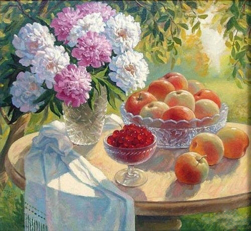 Теги: фрукты, натюрморт, букет, сливы, пионы, цветы, картина.