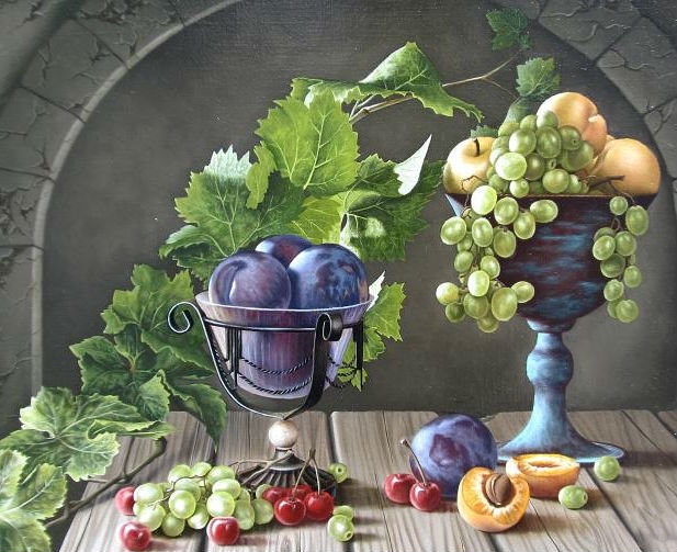 Теги: натюрморт, виноград, сливы, персик.
