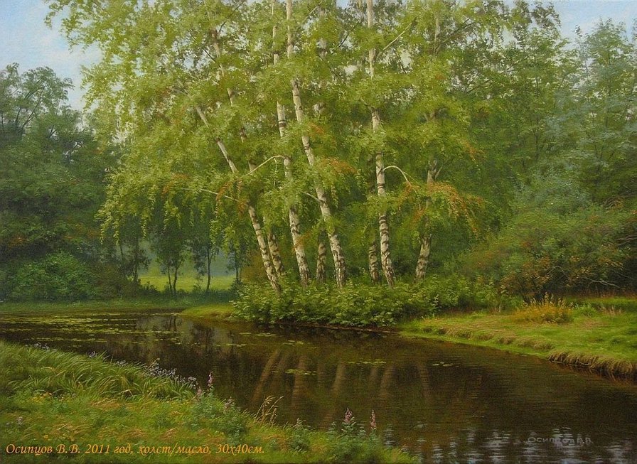 Теги: лето, природа, роща, река, живопись, березы, пейзаж.