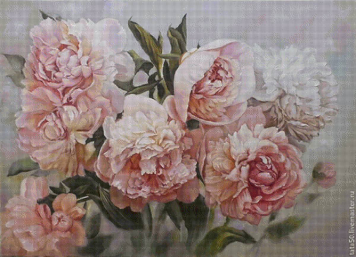 Теги: живопись, пионы, розовые цветы, цветы, тюльпаны, белые цветы, букет.