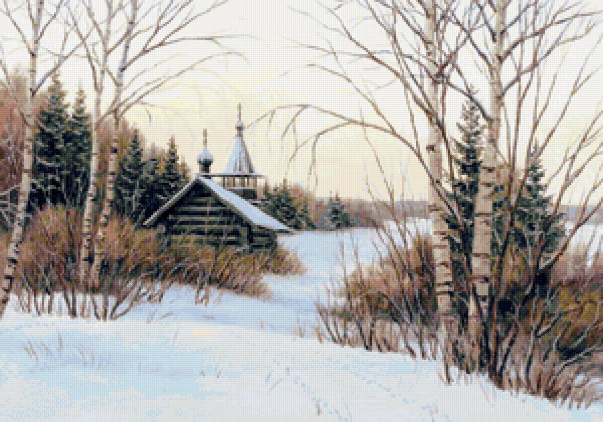 Теги: домик, лес, зимний пейзаж, новый год, пейзаж, церковь, зима, снег.