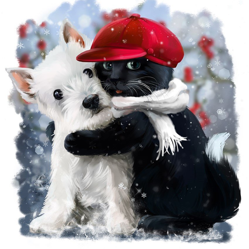 Теги: снег, животные, зима, собака, кот.