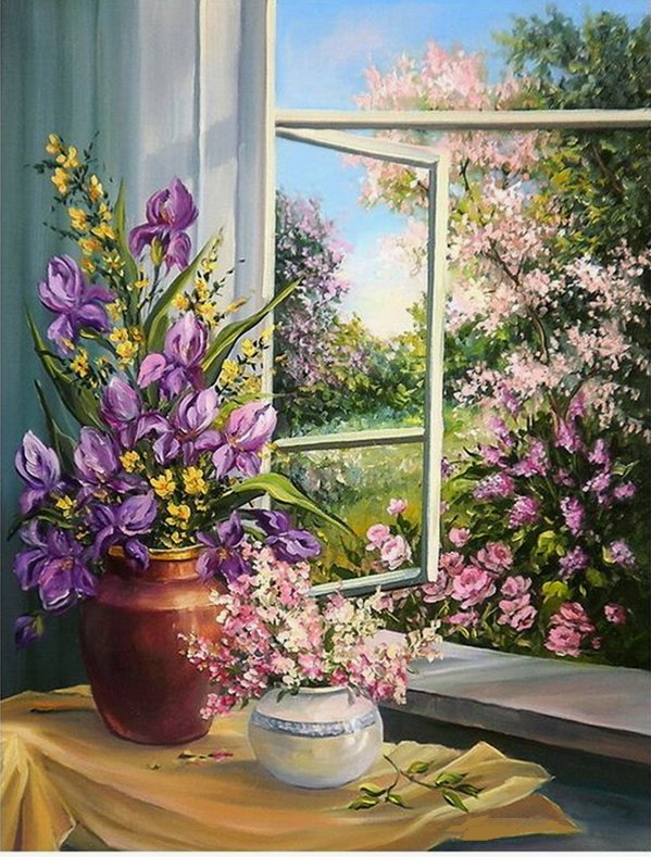 Теги: натюрморт, окно, бабочки, цветы, жемчуг, книга, букет.
