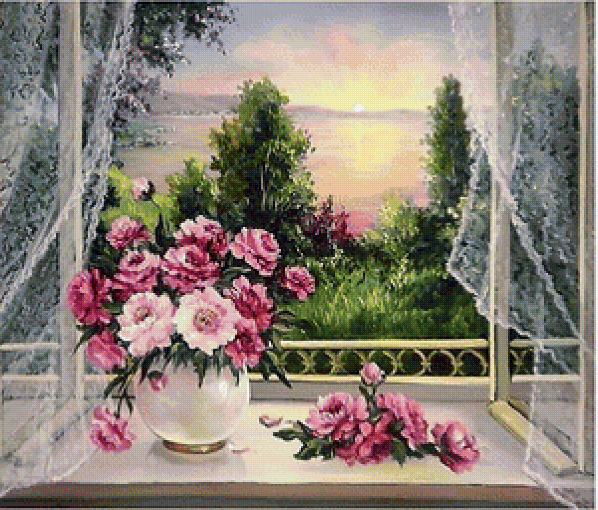 Теги: картина, натюрморт, цветы, живопись, букет, ваза, окно.
