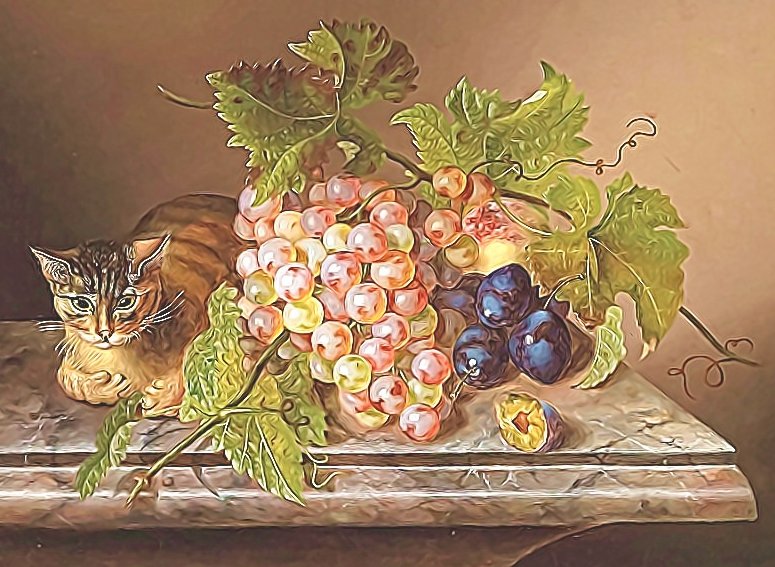 Теги: натюрморт, сливы, фрукты, виноград, груши, живопись.