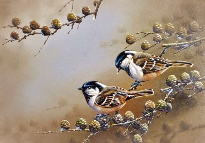 Теги: природа, птички, птицы, подсолнухи, картина, живопись.