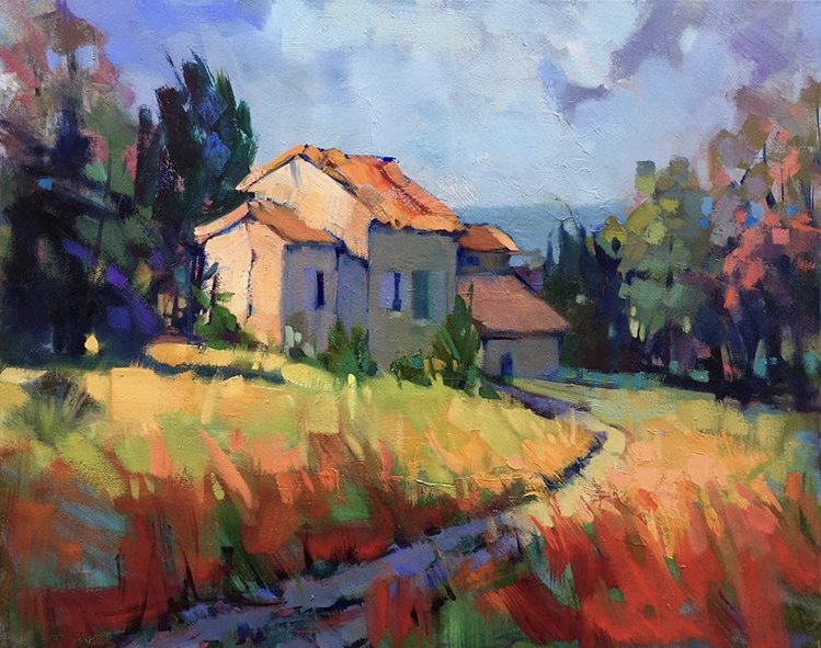 Теги: поле, живопись, цветы, пейзаж, подсолнухи, лето, дом.