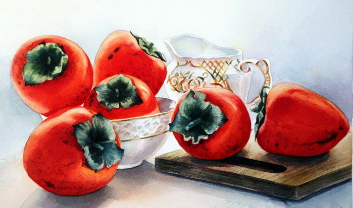 Теги: хурма, фрукты, розы, гранат, натюрморт, живопись, канарейки.