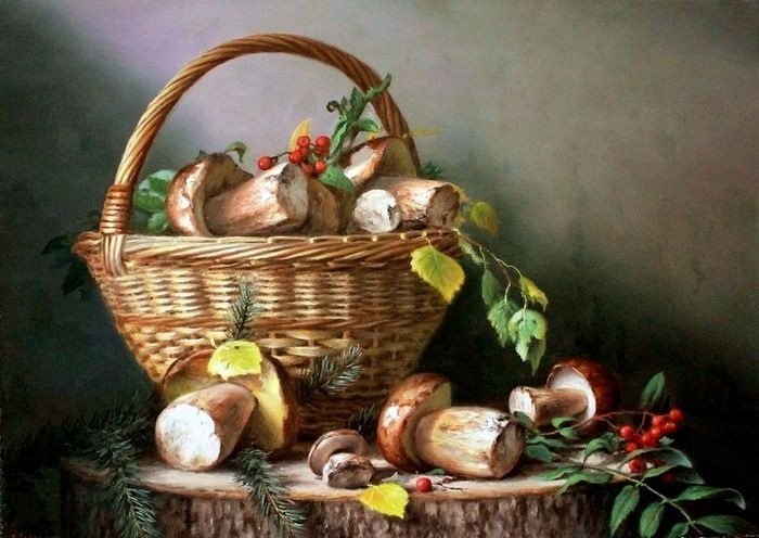 Теги: лес, кухня, еда, грибы, корзина, картина, натюрморт.