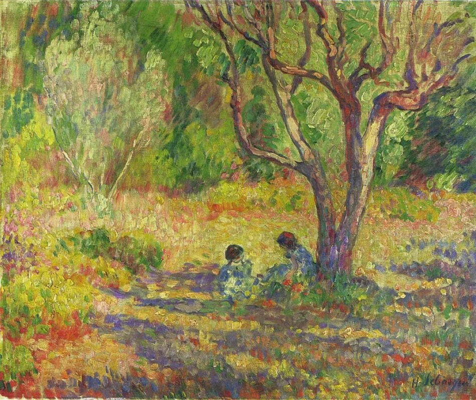 Теги: сад, мать, дети, животные, живопись, природа, кошка, котята.