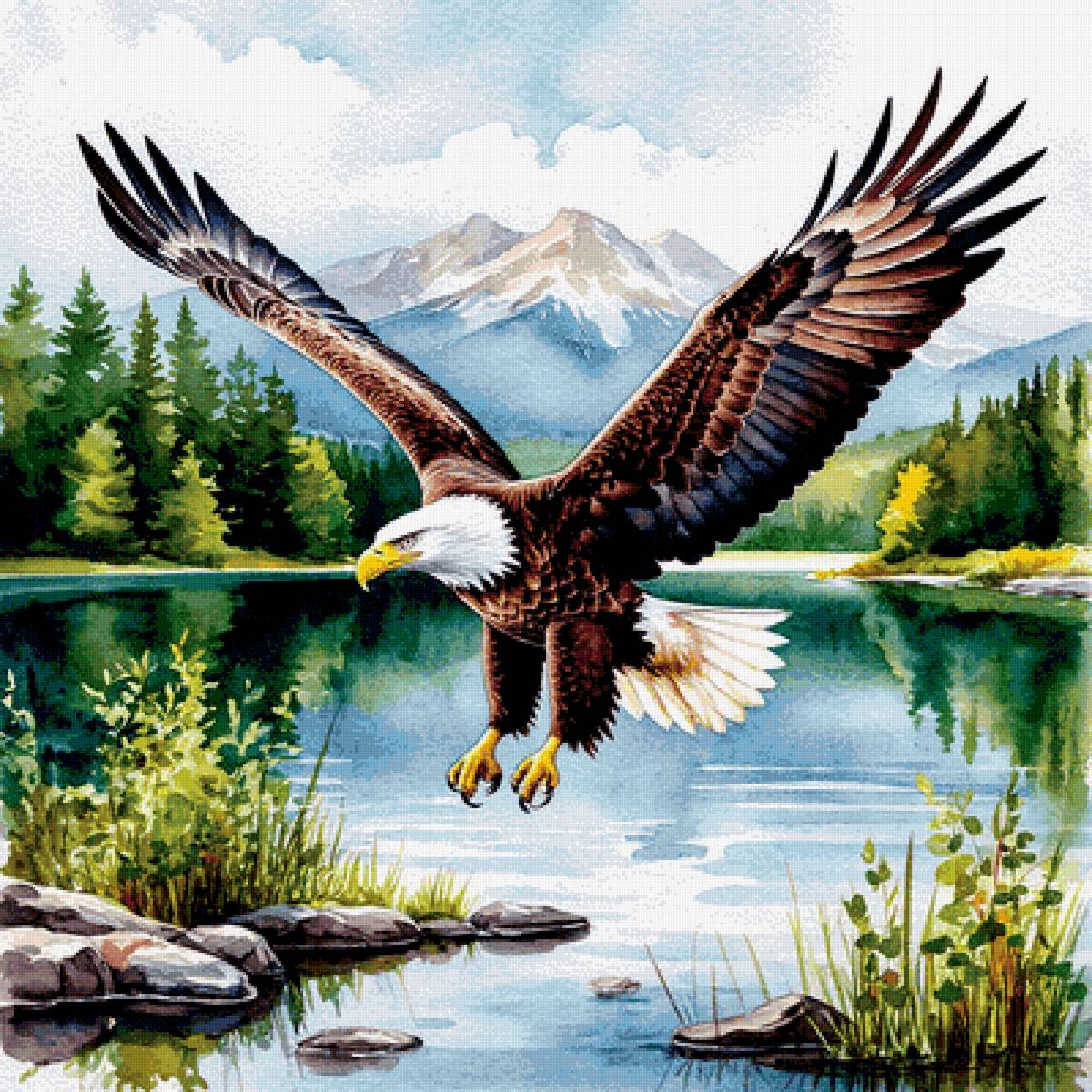 Схема вышивки «Белоголовый орлан парящий над озером. Акварель» (№2890696)