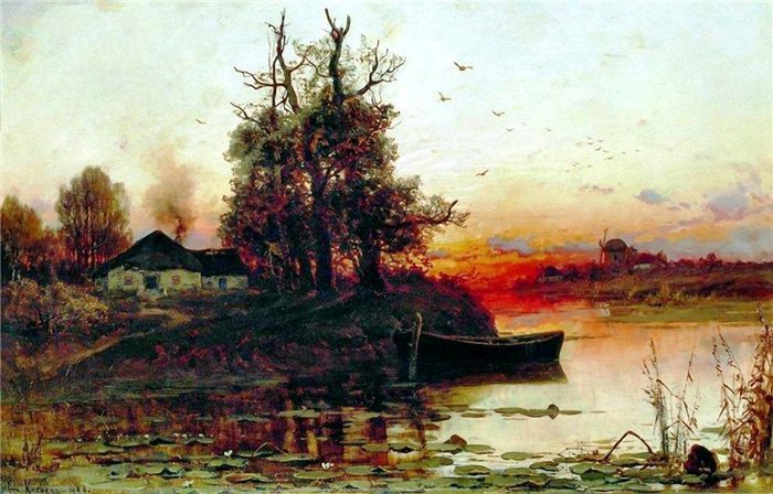 Теги: река, закат, лето, вечер, пейзаж, березы, живопись, природа.