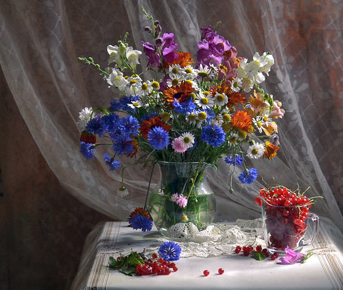 Теги: цветы, сливы, букет, ягоды, натюрморт., ромашки, клубника.