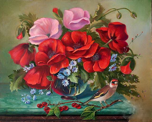 Теги: натюрморт, горшок, цветы, живопись, маки, глина, букет.