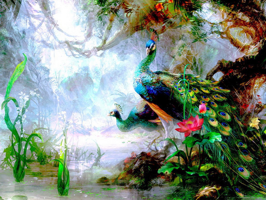 Теги: птицы, павлины, цветы.