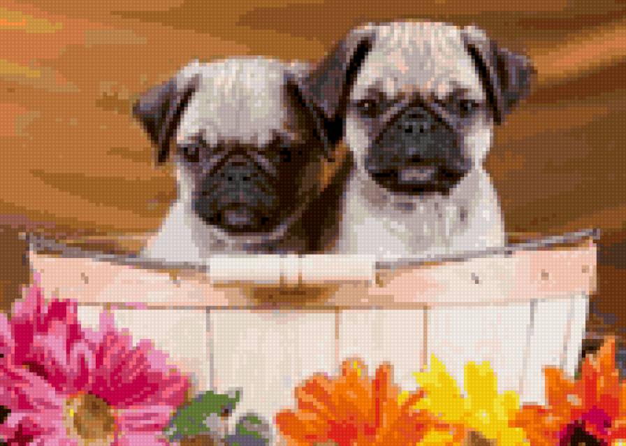 Схемы вышивки, похожие на «мопсики с цветами» (№575049) по сюжету