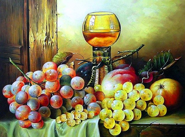 Теги: натюрморт, пейзаж, виноград, фрукты, живопись, бокал, сыр.