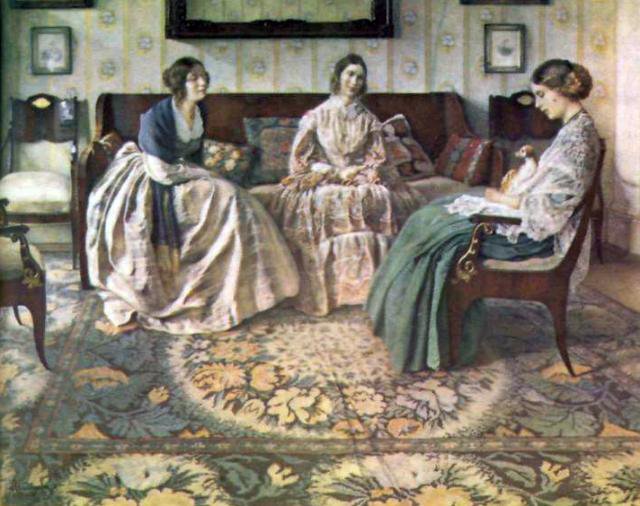 Теги: диван, ковер, гостиная, письмо, разговор, платья, дамы.