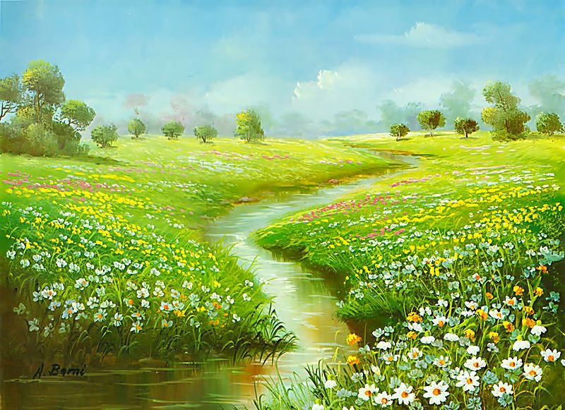 Схемы вышивки, похожие на «речушка через ромашковое поле» (№986169) по сюжету