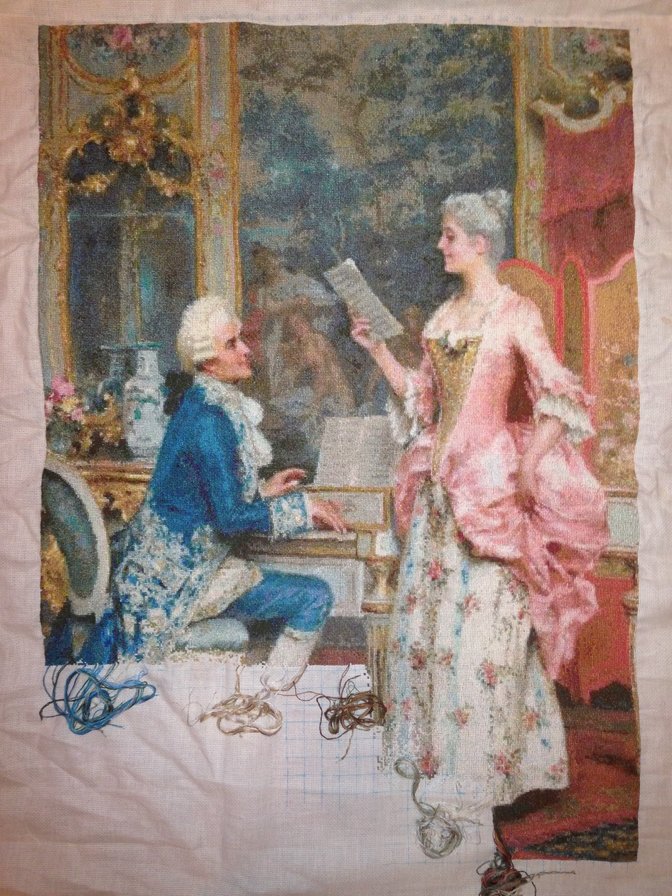 Картина красивая,первый опыт ГК и сразу размахнулись на большой размер,молодец! У меня тоже так было,первая работа гигантская,а с размером ткани просчиталась,так и лежат теперь два полотна,не сшитых. Нитки ДМС лучше не заменять аналогами,не обижайтесь на меня,просто опытным взглядом видно,что замена искажает оригинал. Вам осталось уже немного,столько работы проделано.Скоро будет долгожданное завершение,удачи Вам и вдохновения!